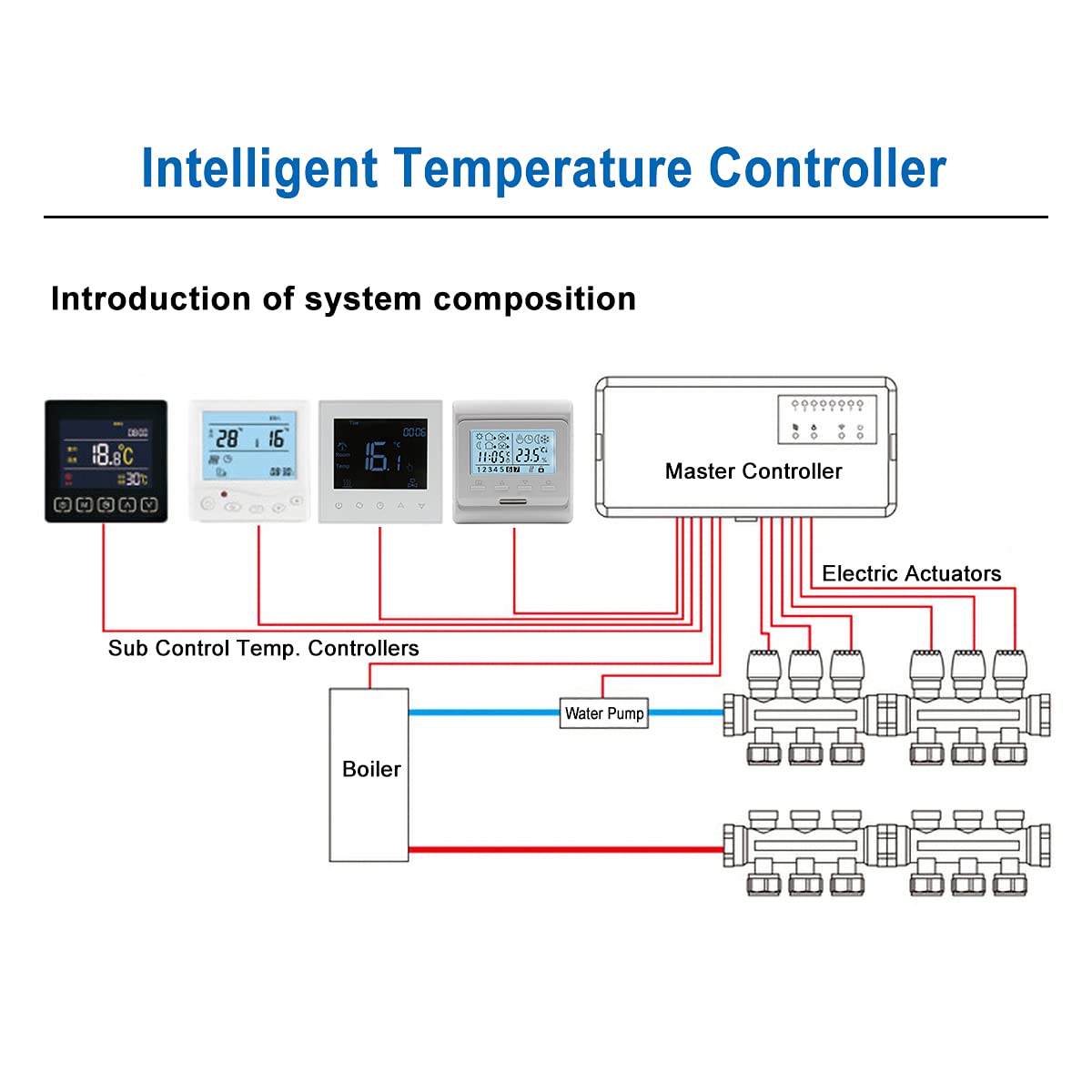 Der Hub-Controller Bis zu 8 Zonen pro Hauptcontroller. Für Fußbodenheizungen und an der Wand hängende Heizkörperverteilersysteme. Das System umfasst elektronische thermische Stellantriebe, Kessel, Pumpen und verschiedene Mischventile. Jeder Ausgang hat eine entsprechende Kontrollleuchte, um Fehler leicht zu finden. Er wird verwendet, um den Gaskessel, die Umwälzpumpe oder den elektrischen Stellantrieb ein- oder auszuschalten, um eine komfortable Temperaturregelung zu erreichen und den Energieverbrauch zu senken.