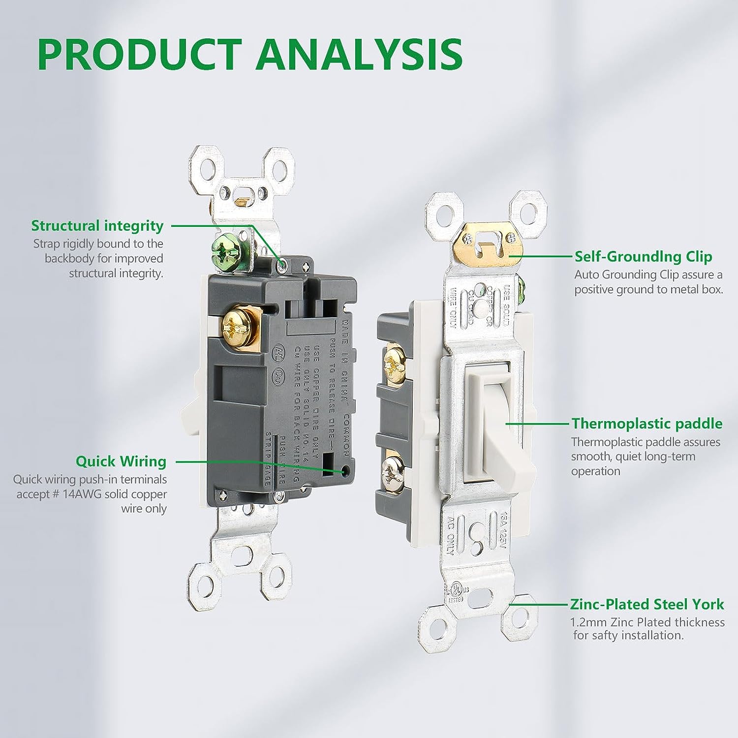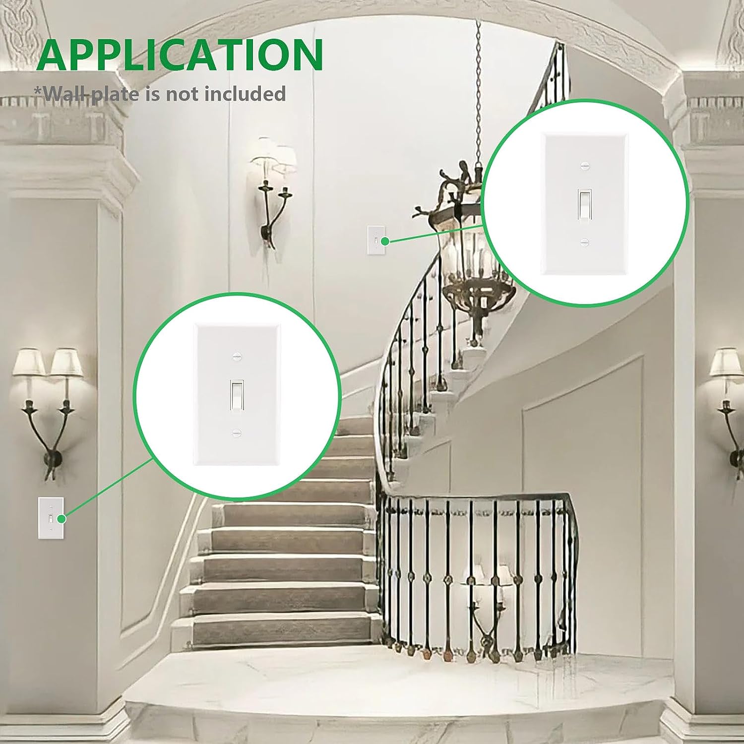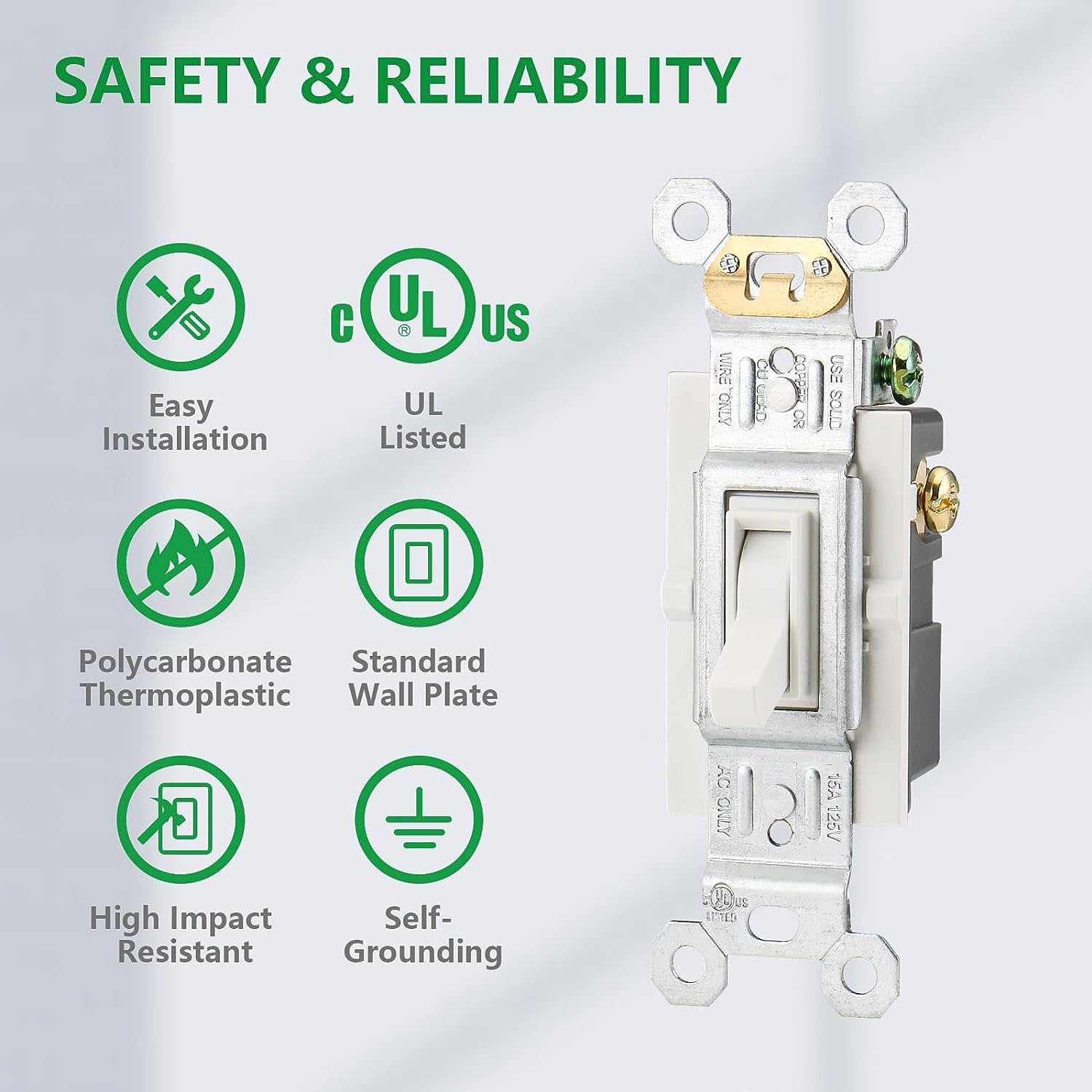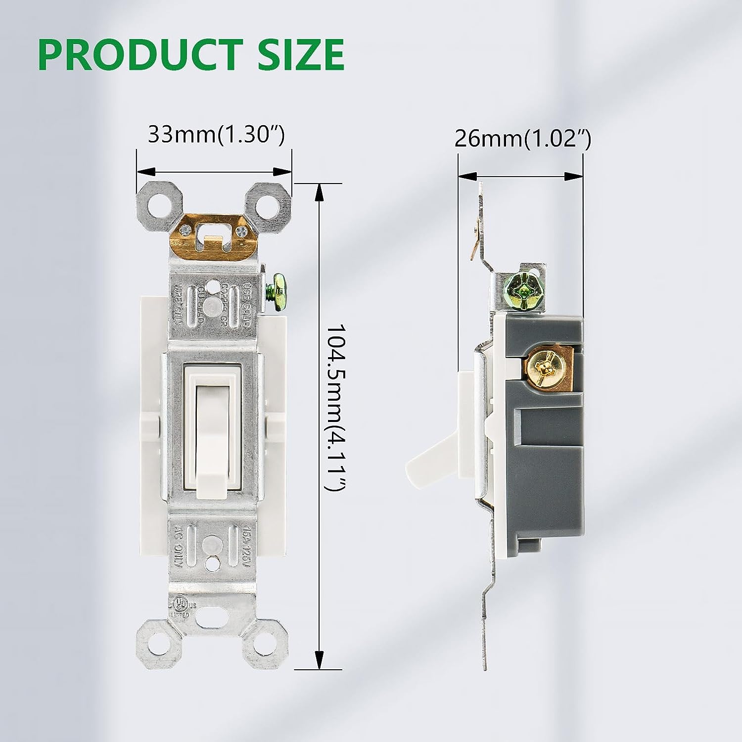 Baomain 3-Wege-Kippschalter für Licht, 15 A, 120 Volt, für den Wohnbereich, leiser Wechselstromschalter, selbsterdend, Ersatz für Ein-/Ausschalter in der Wand, UL-zertifiziert, weiß