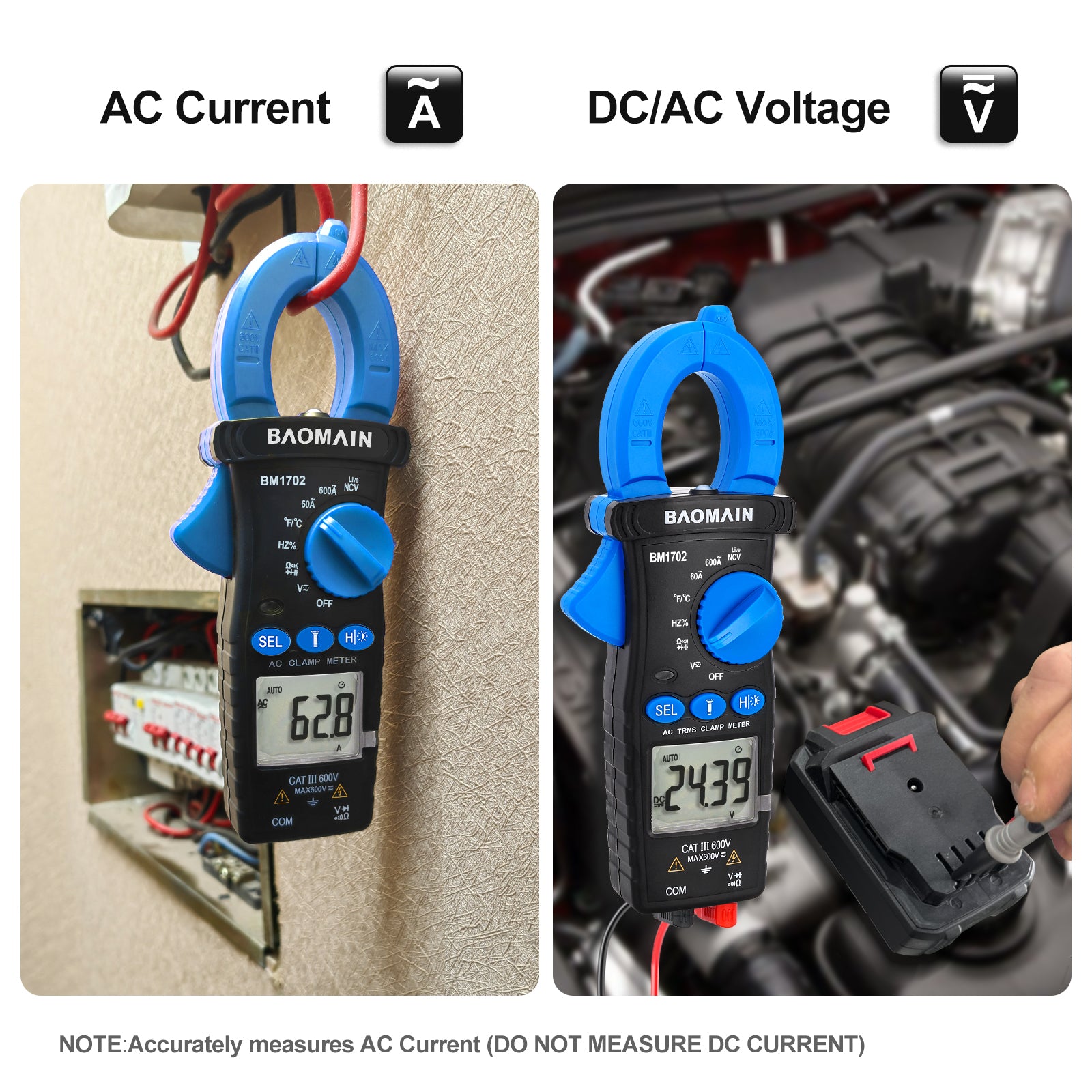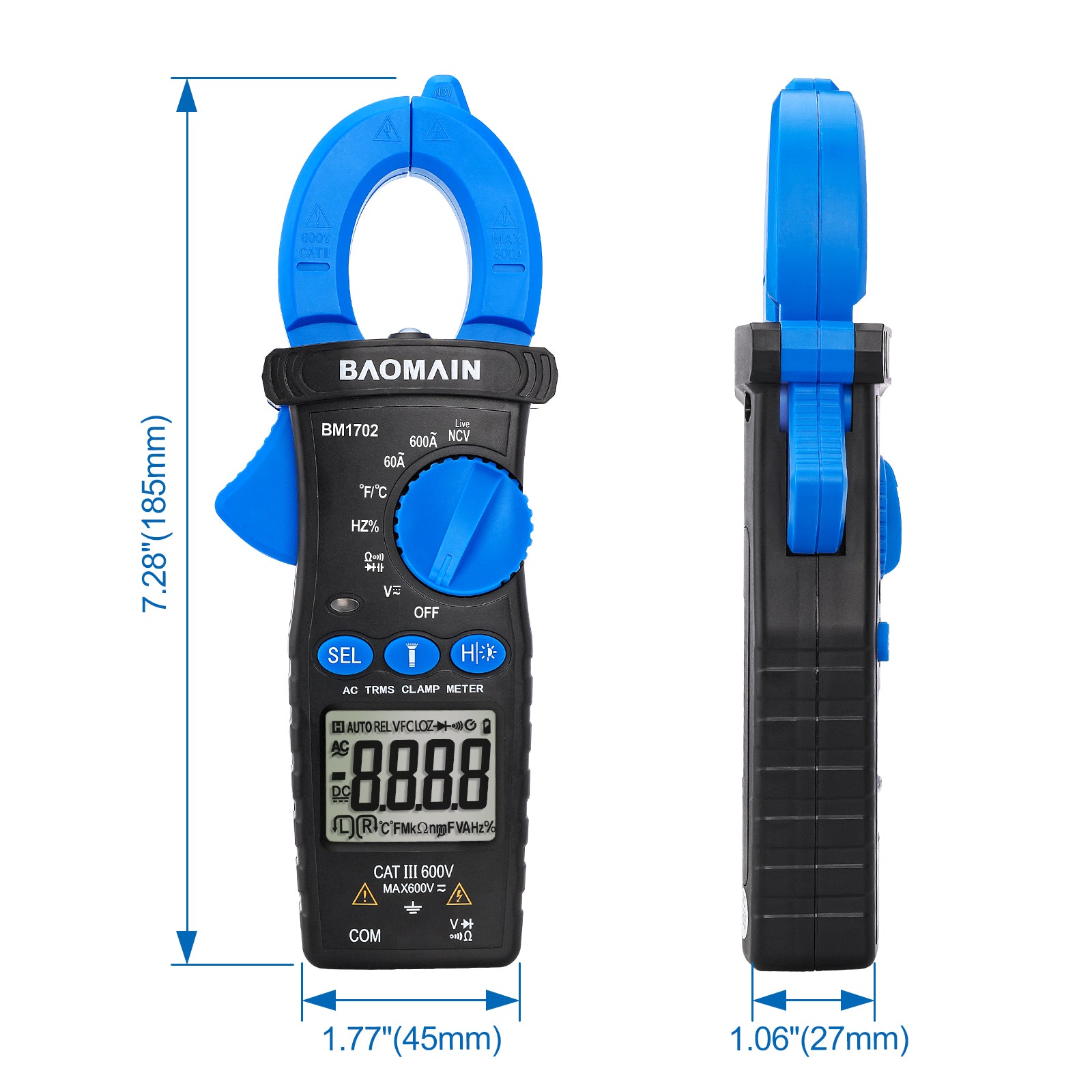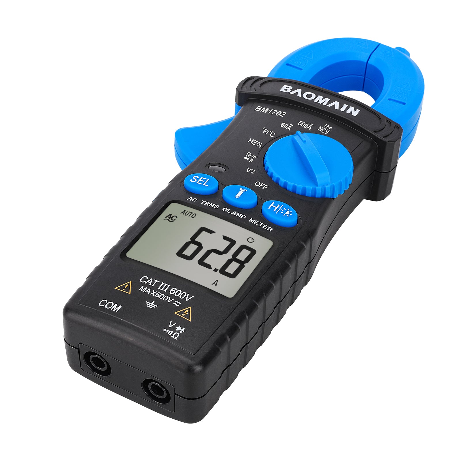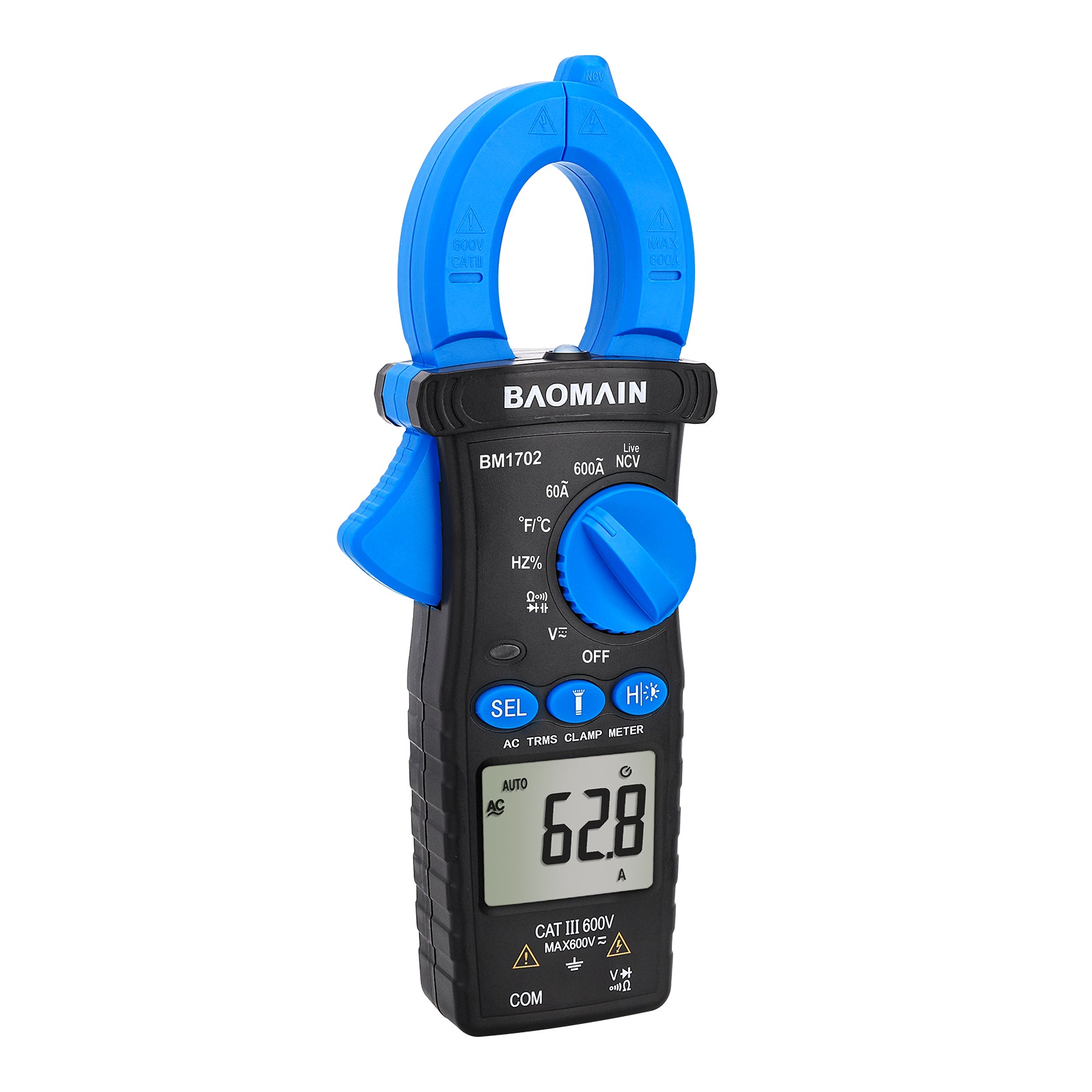 Baomain AC-Digital-Stromzange, T-RMS 6000 Zählt Mehrzweck-Stromzange für 60 A/600 A Wechselstrom, Wechsel-/Gleichspannung, Temperatur, Diode, Widerstand, Kapazität, Durchgangsprüfung, NCV, Frequenz, BM1702