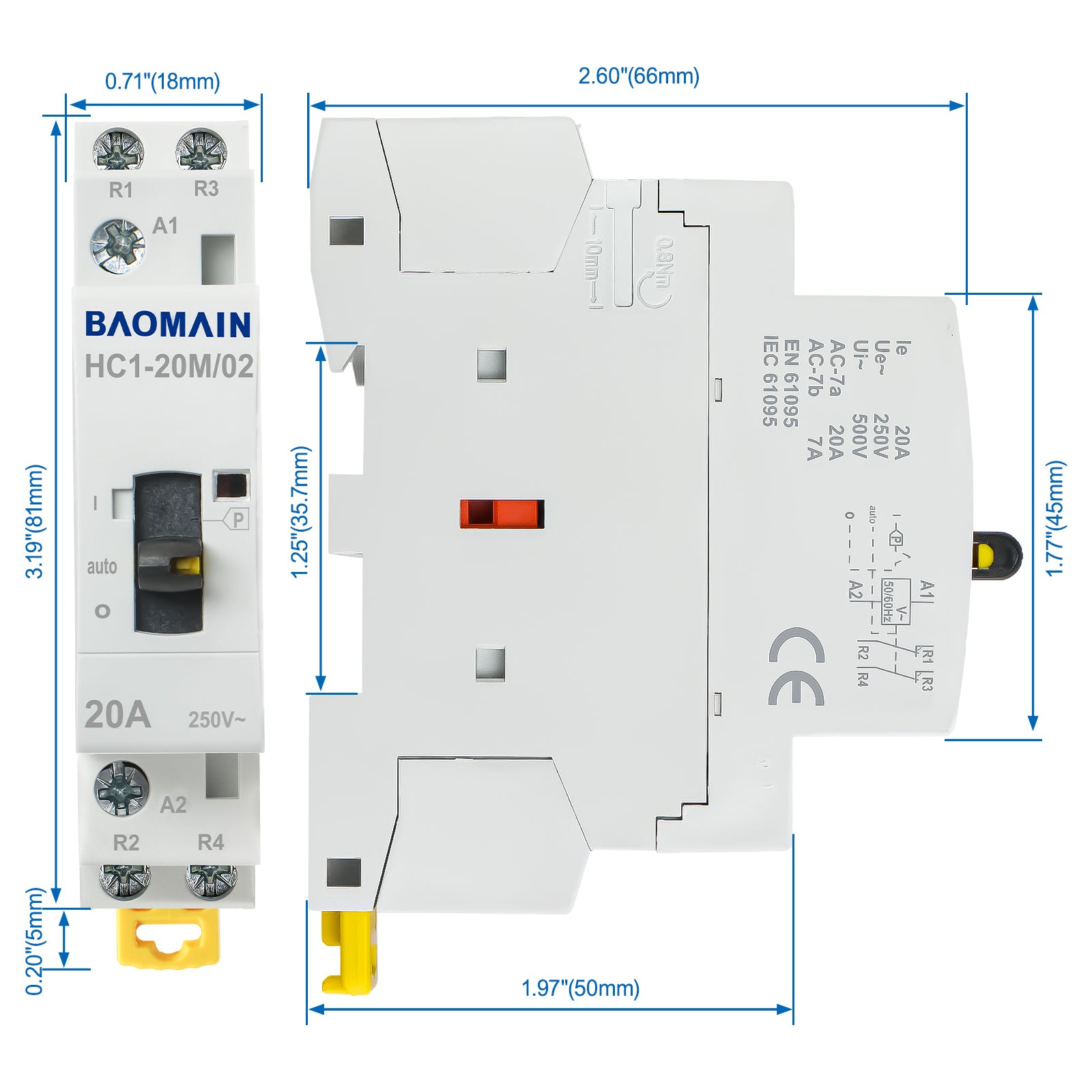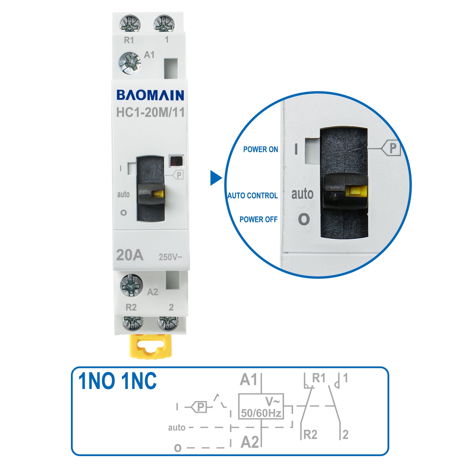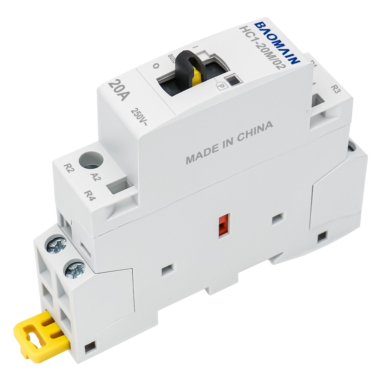 Baomain Manueller Haushalts-Wechselstromschütz HC1-20M 24 V/110 V/220 VAC 20 A 2-polig 50/60 Hz Modularer Schütz Schaltkreissteuerung 35 mm DIN-Schiene