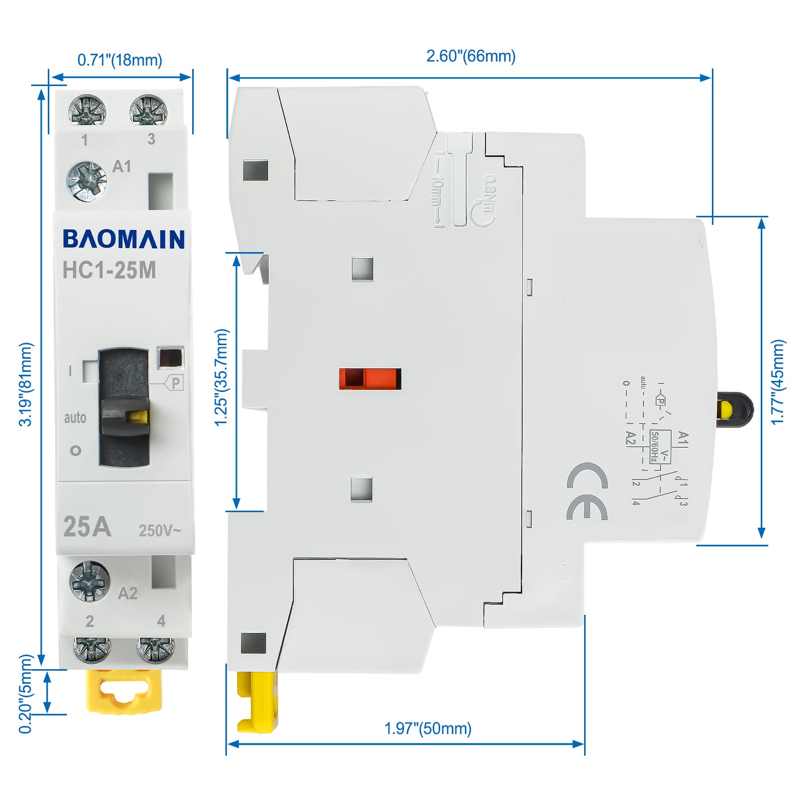 Baomain Manueller Haushalts-Wechselstromschütz HC1-25M 24 V/110 V/220 VAC 25 A 2-polig 50/60 Hz Modularer Schütz Schaltkreissteuerung 35 mm DIN-Schiene