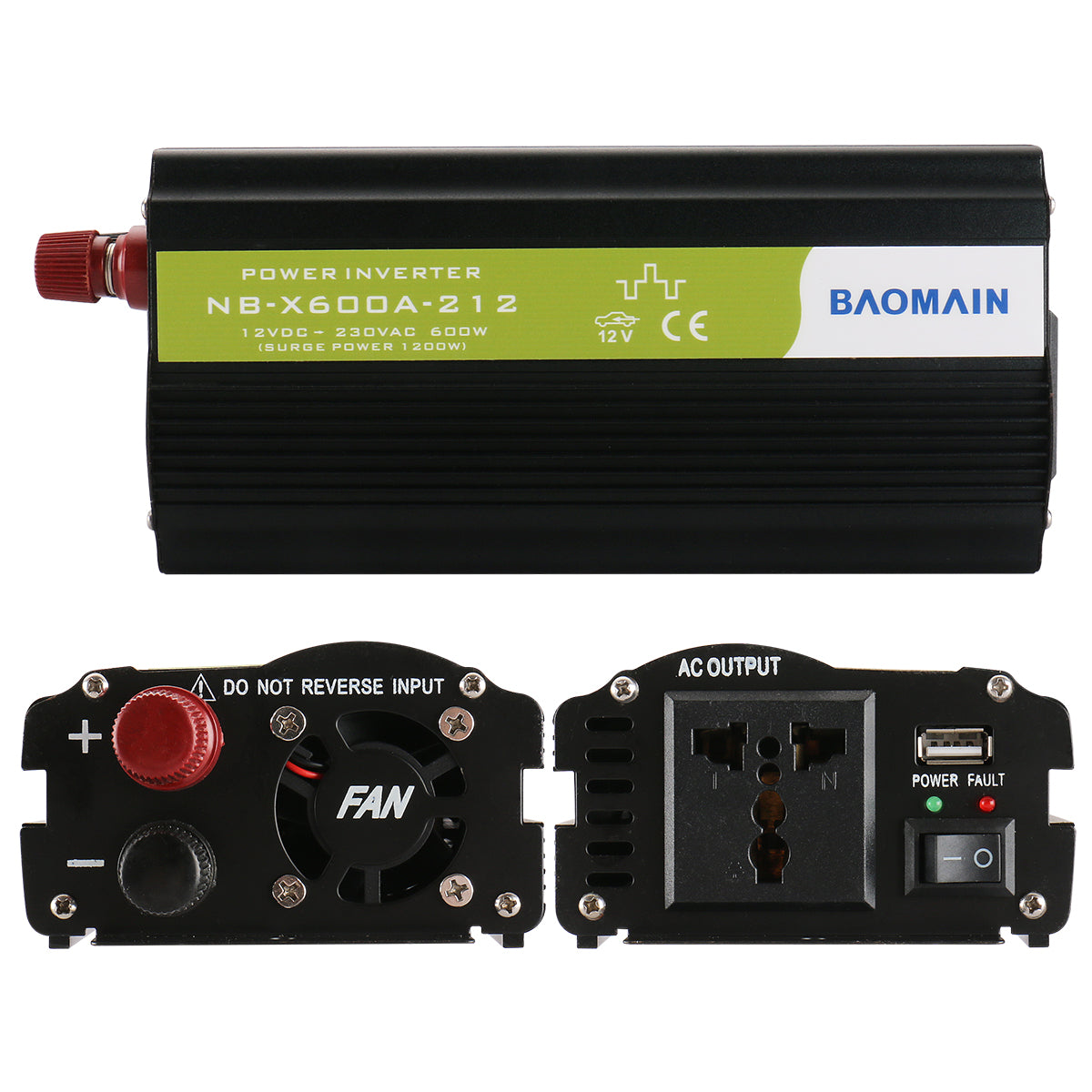 Baomain NB-X600A-212 12V auf AC 230V 300W Auto-Leistungstransformator mit Universaladapter und USB-Ladeschnittstelle