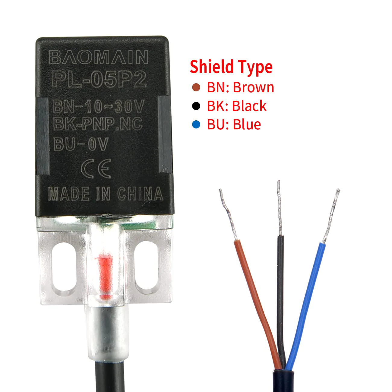 Baomain Quadratischer induktiver Näherungssensorschalter, nicht abgeschirmter Typ PL-05P2, Detektorabstand 5 mm, 10–30 VDC, 200 mA, PNP, normalerweise geschlossen (NC), 3-adrig