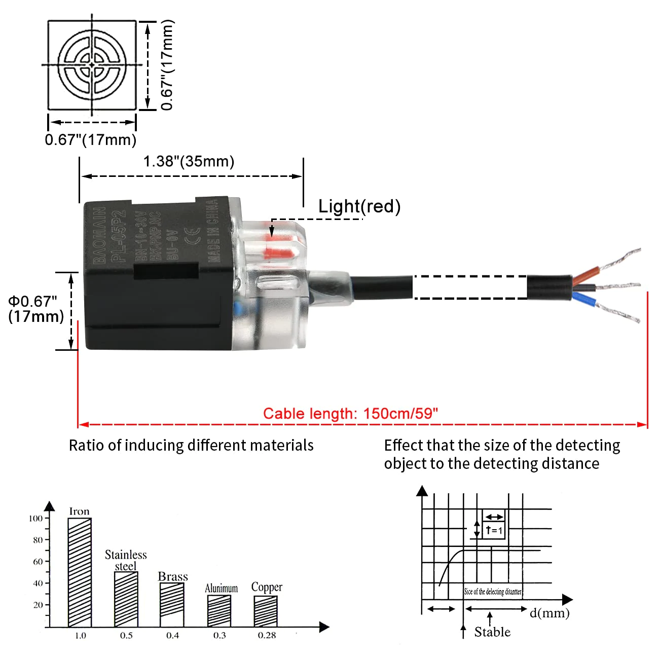 Objekt erkennen: Magnetisches Metall (die Erkennungsdistanz verringert sich, wenn es sich um nicht magnetisches Metall handelt); Erkennungsdistanz 5 mm; Einstelldistanz 0–4 mm; Stromversorgung: DC 10–30 V; Temperaturbereich: -25 - +60 °C; Isolationswiderstand > 50 MΩ; Material ABS; Maße: 17 x 17 x 35 mm; Montageart: Nicht abgeschirmter Typ; CE-zertifiziert.