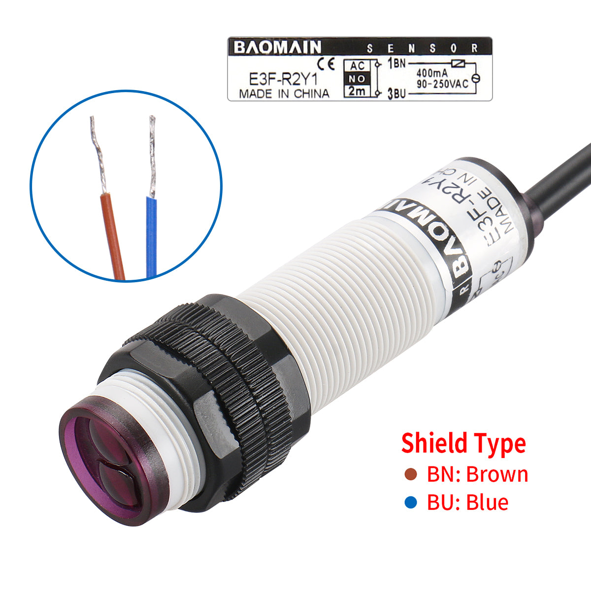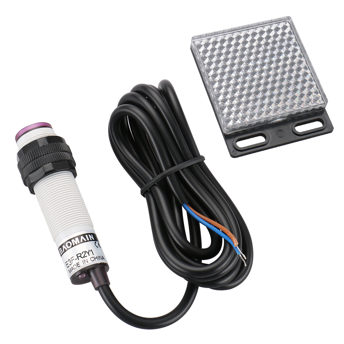 Baomain Photoelektrischer Sensor E3F-R2Y1 Retroreflektierender optischer Sensorschalter AC 90-250 V NO Erfassungsabstand 2 m mit Reflektorplatte