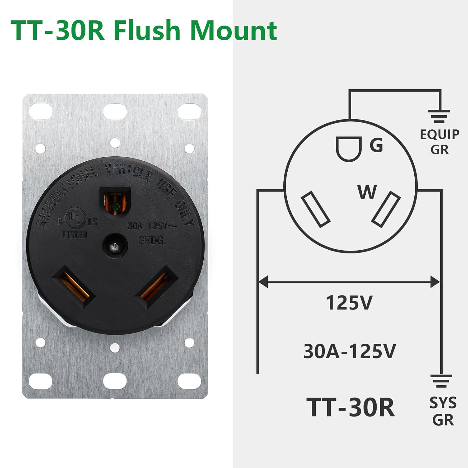 Baomain Industrial Power Wall RV-Steckdose, NEMA TT-30R 30 Ampere 125 V, 3-polige 3-adrige Steckdose, geeignet für Wohnmobilanhänger, UL-gelistet, BAS-022, Schwarz