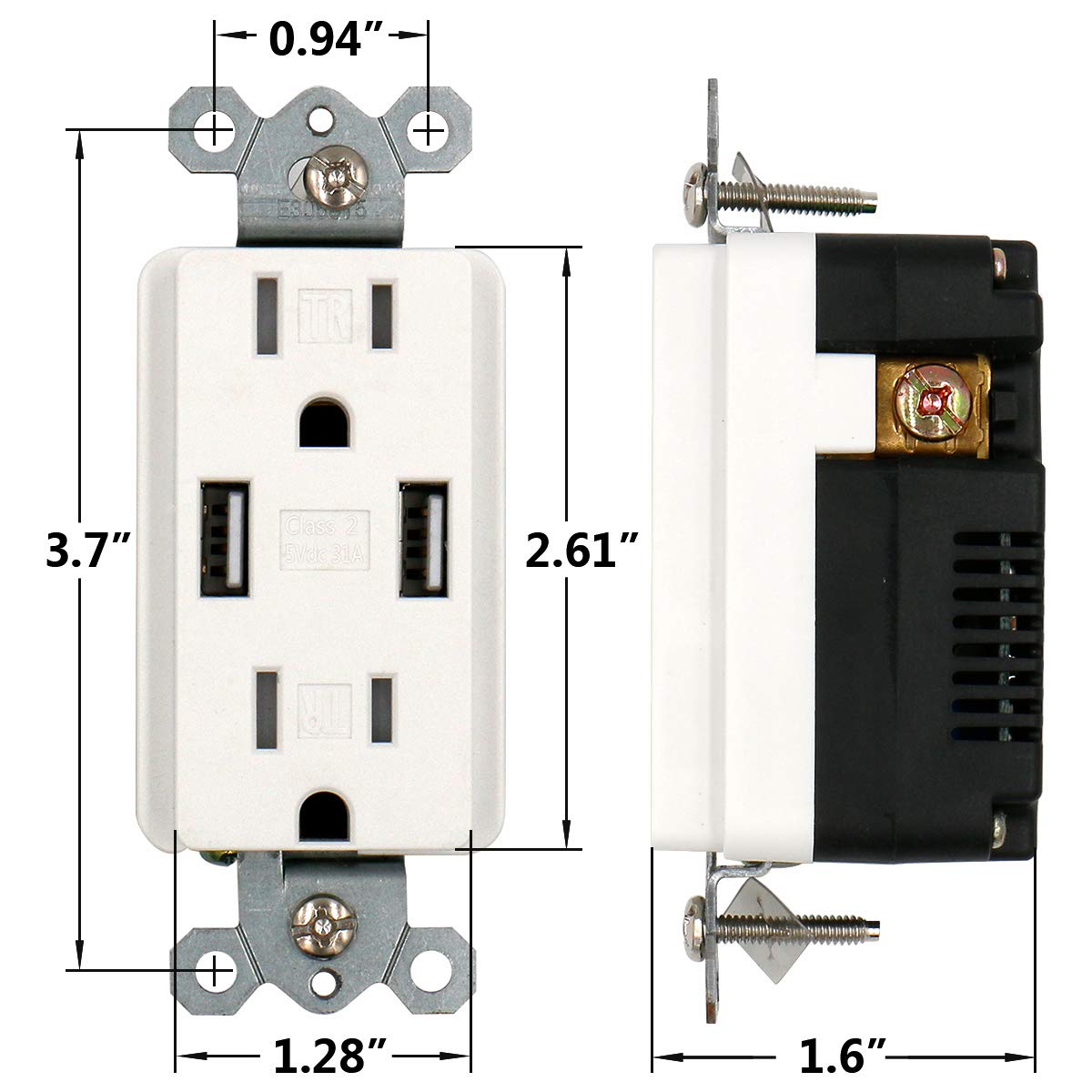 Der USB-Ladebuchsen-Hub lässt sich einfach in die Wand Ihres Schlafzimmers, Wohnzimmers, Ihrer Küche und jedes anderen Zimmers einbauen, um das Aufladen schnell, einfach und bequem zu machen. Die Buchse ist seitlich verdrahtet, um eine breite Kompatibilität mit unterschiedlichen Verdrahtungsanforderungen zu gewährleisten. Die USB-Anschlüsse sind Klasse 2.0 und verfügen über eine kombinierte Leistung von 5 VDC, 3,1 Ampere. Die Anschlussschrauben nehmen Kupfer- oder kupferummantelte Drähte bis zu 10 AWG auf. Die USB-Ladebuchse muss in einer Wanddose mit den Abmessungen 3 x 2 x 2 1/2 Zoll installiert und gemäß den Anforderungen für die Befüllung von NEC-Artikel 314 verdrahtet werden.