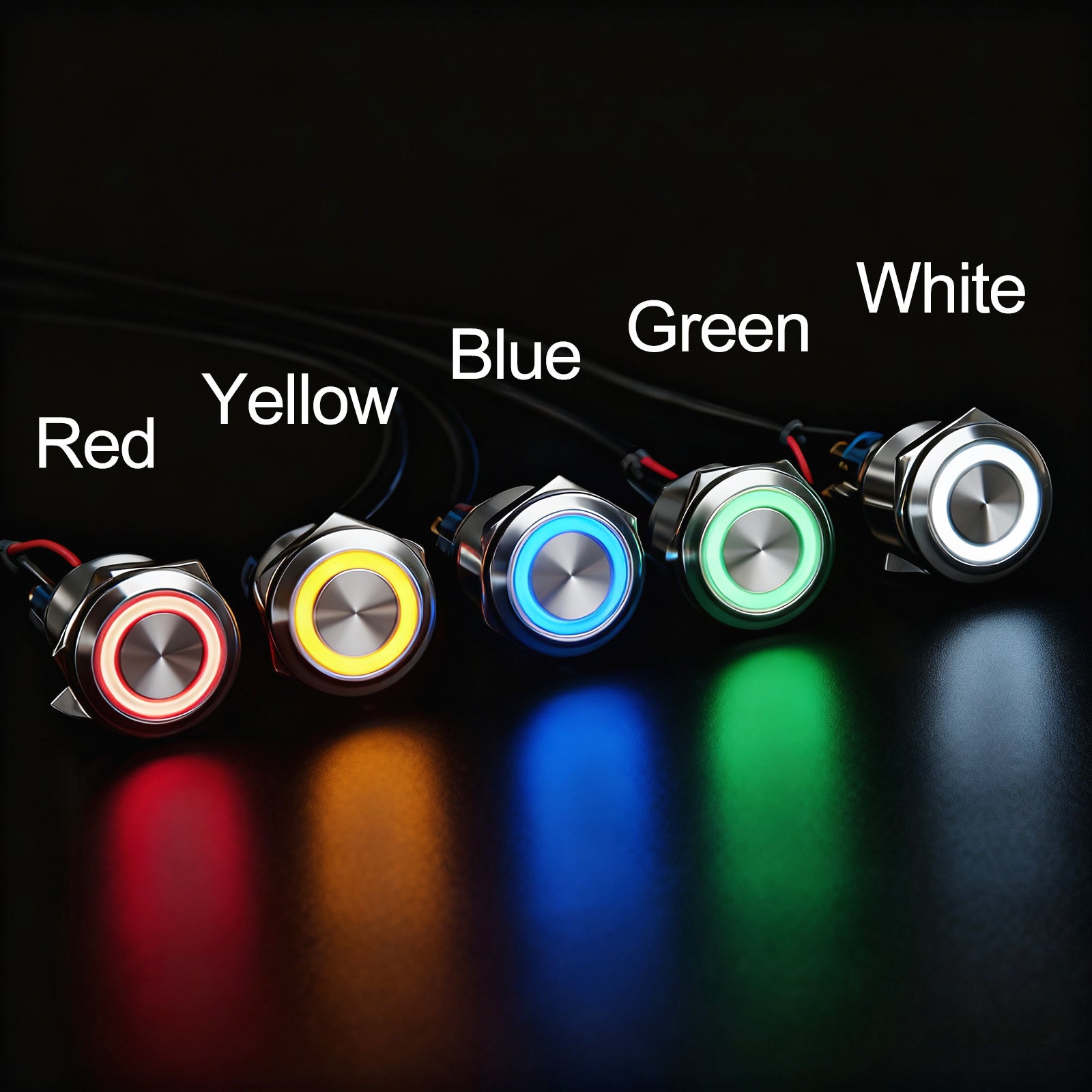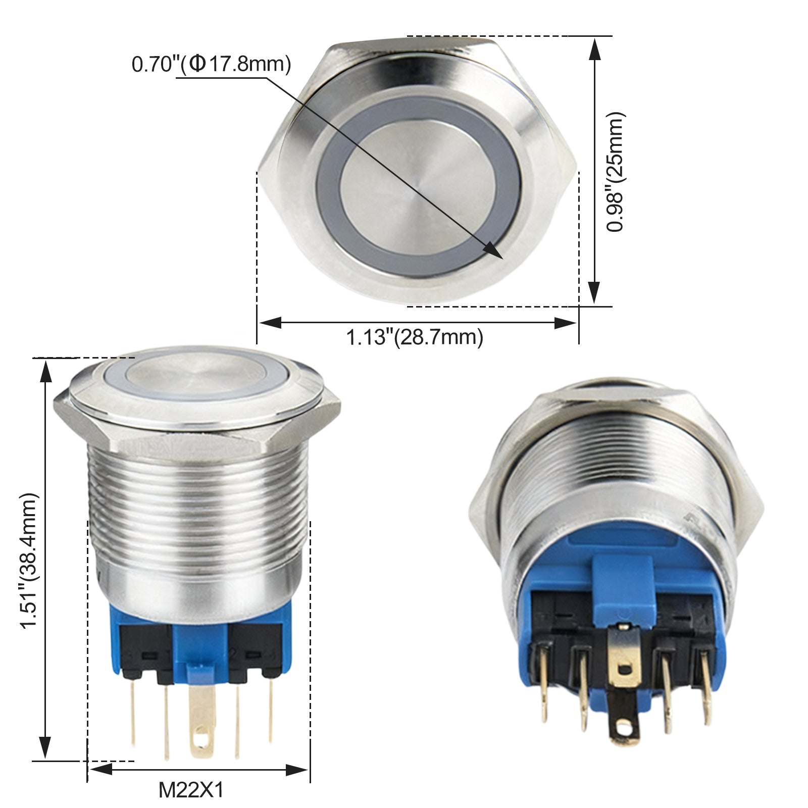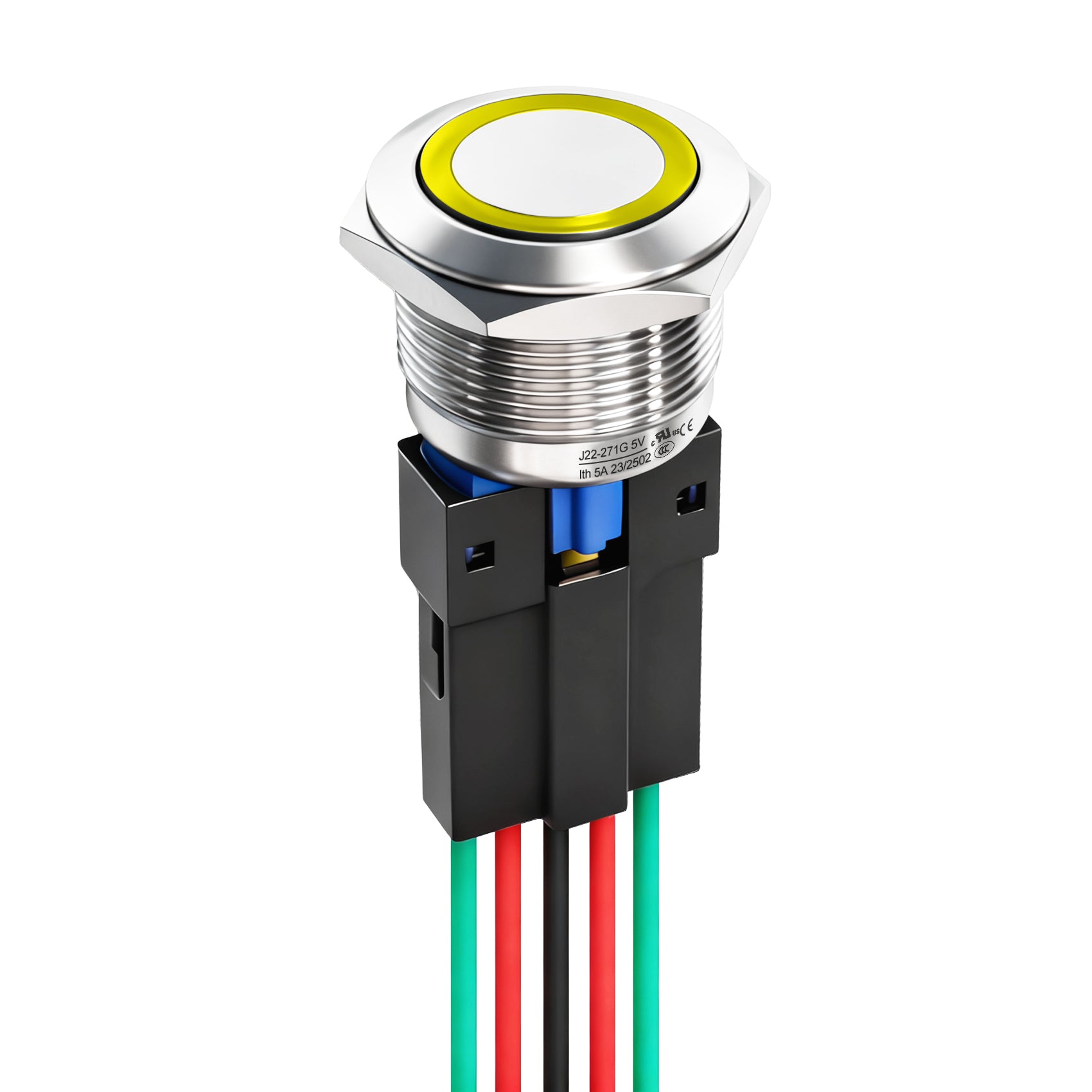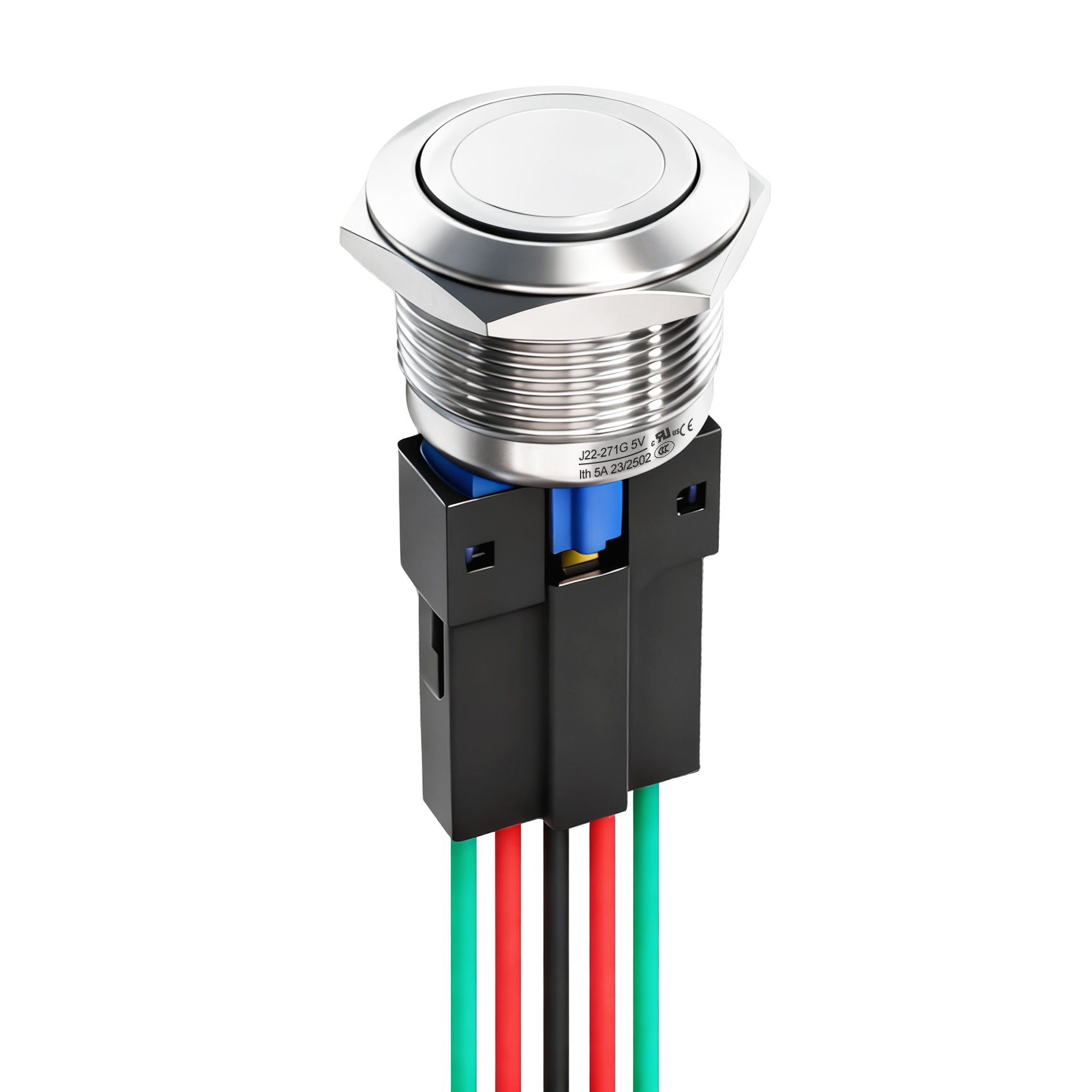 Baomain 22mm (7/8'') Momentary Metal Push Button Switch with Pigtail, AC/DC 12V Eagle Eye LED Stainless Steel Button Switch, 5A 250VAC NO+NC Waterproof for Cars,Boat,Truck, DIY, UL CE Approved