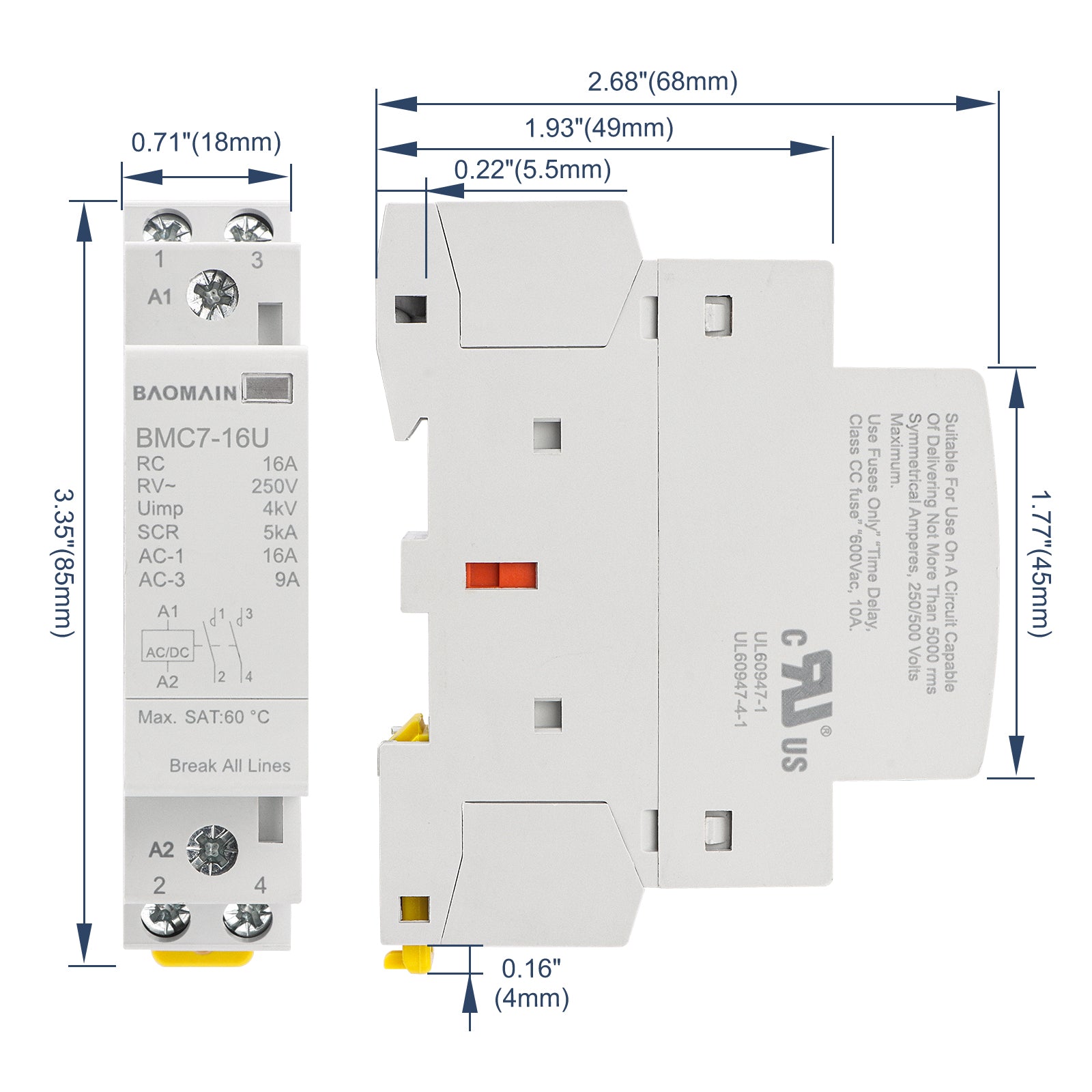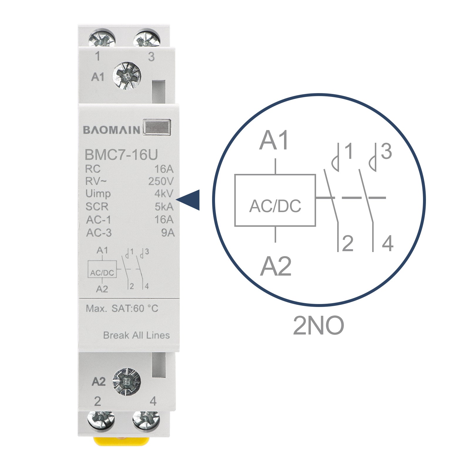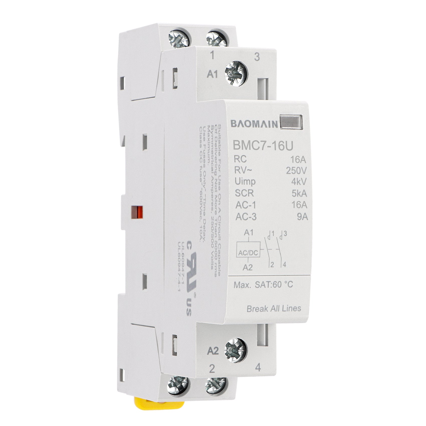 Baomain 2NO AC/DC Household Contactors, 16A 2P Modular Contactor, 2 Poles Normally Open, DIN Rail Mount, UL Listed (BMC7-16U)