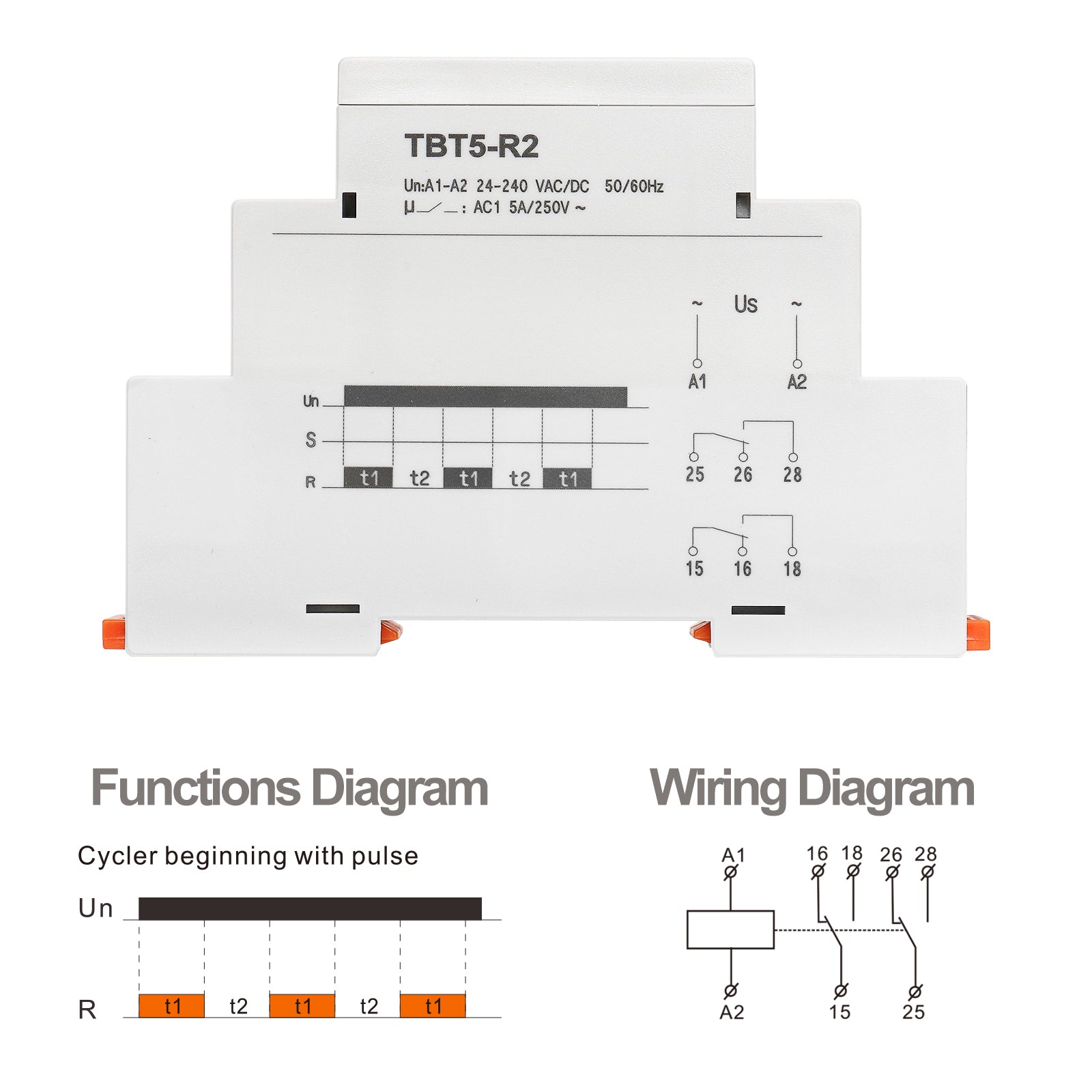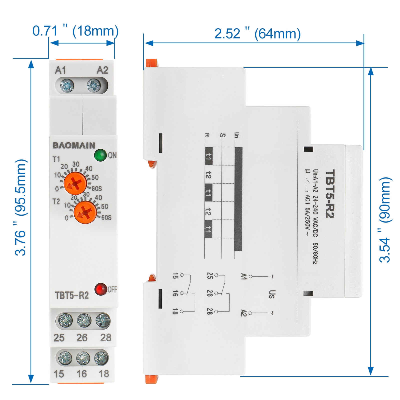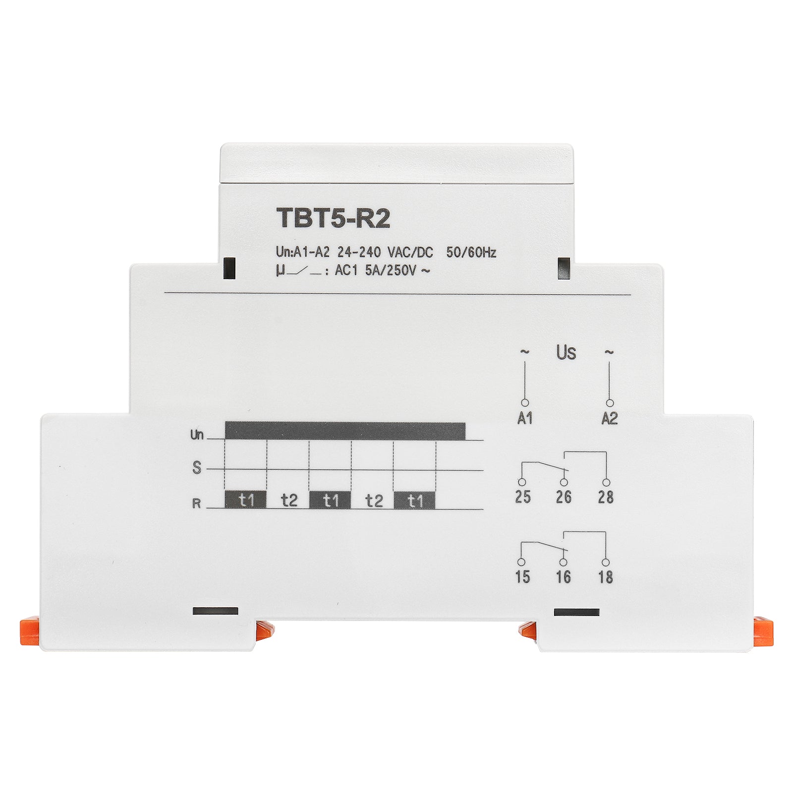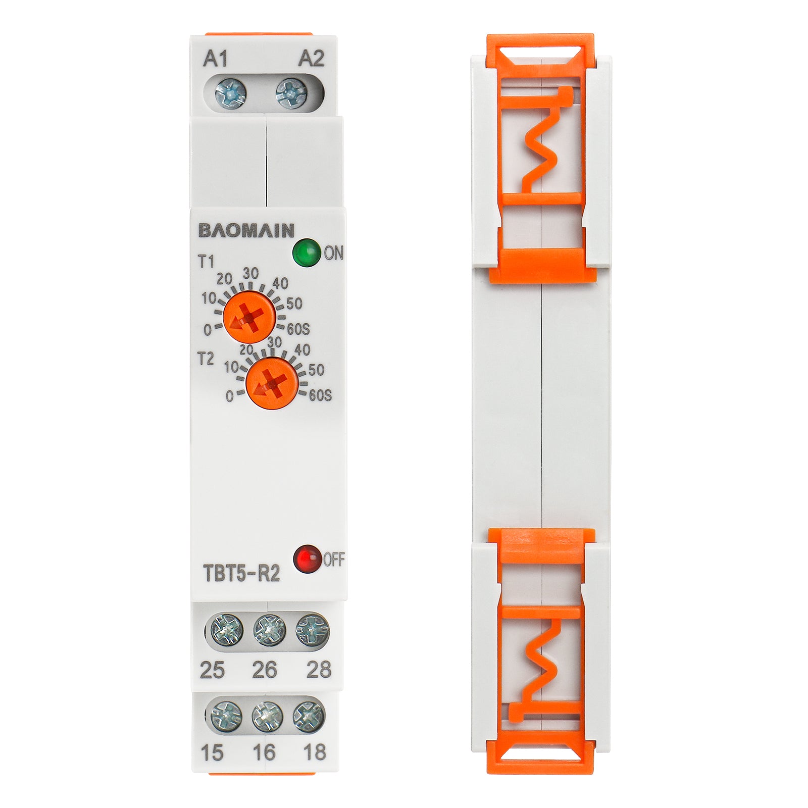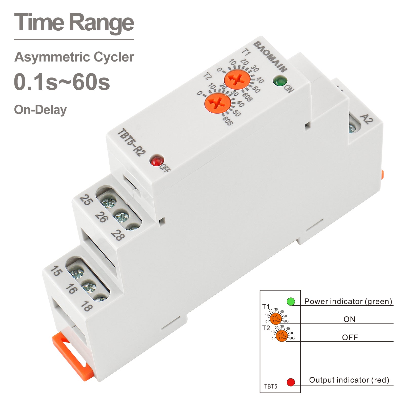 Baomain Asymmetric Cycler Time Relay, 5A 24V-240VAC/DC SPDT, Repeat Cycle Time Relay, On-Delay for Industrial Equipment, Lighting Control, Heating Control TBT5-R2