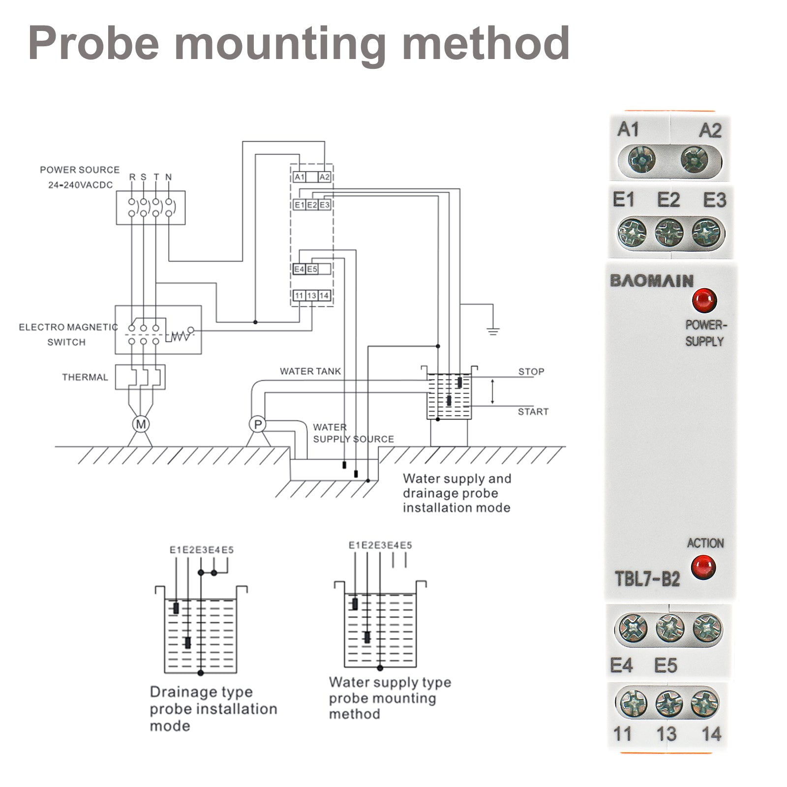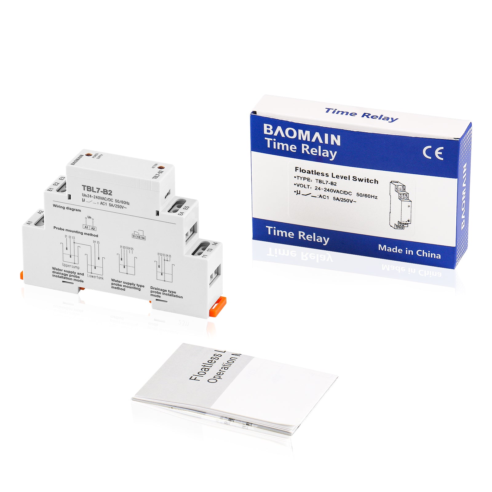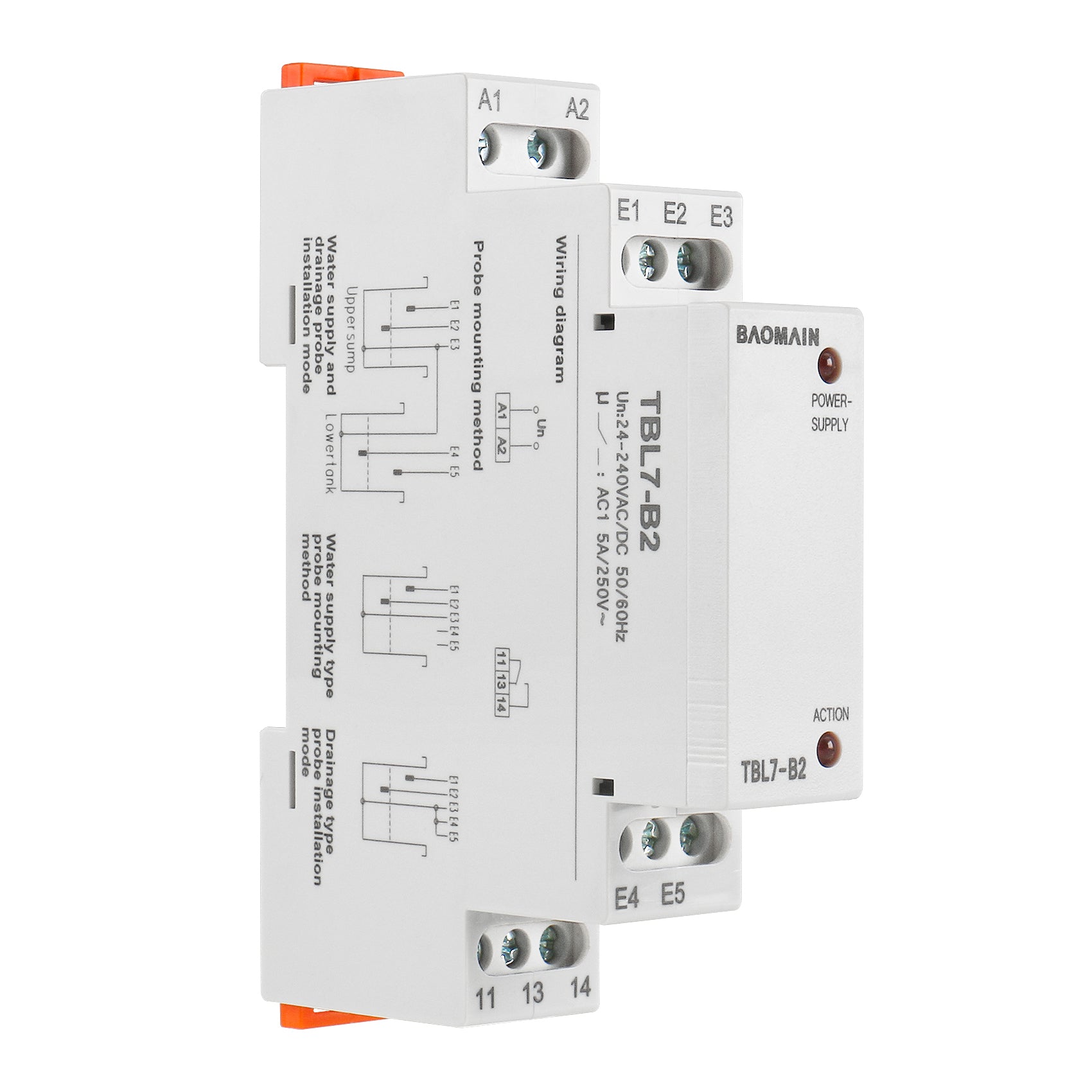 Baomain Liquid Timer Control Relay, 5A AC/DC24-240V 2-SPDT, DIN Rail Mounting Three Electrode Water Level Controller TBL7-B2