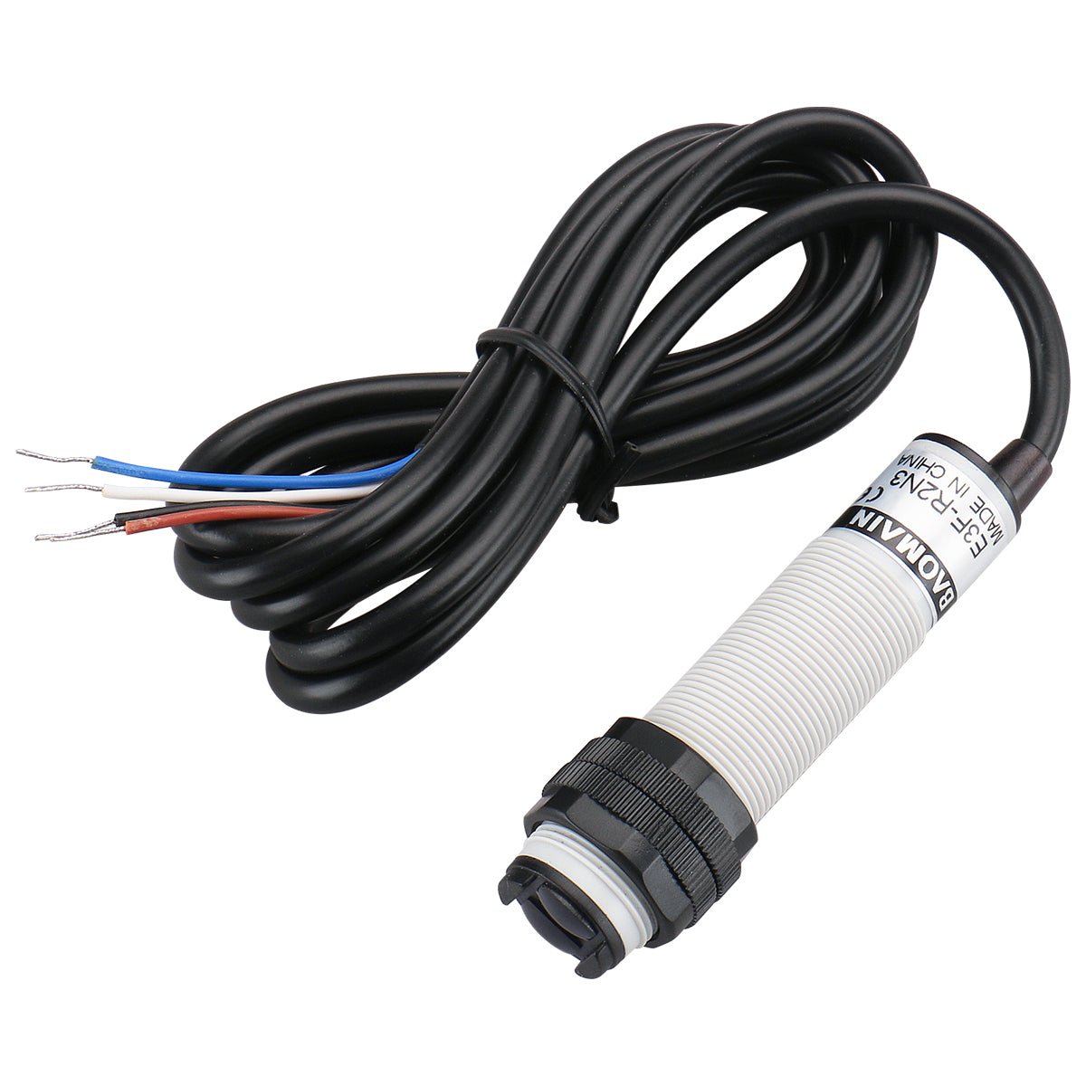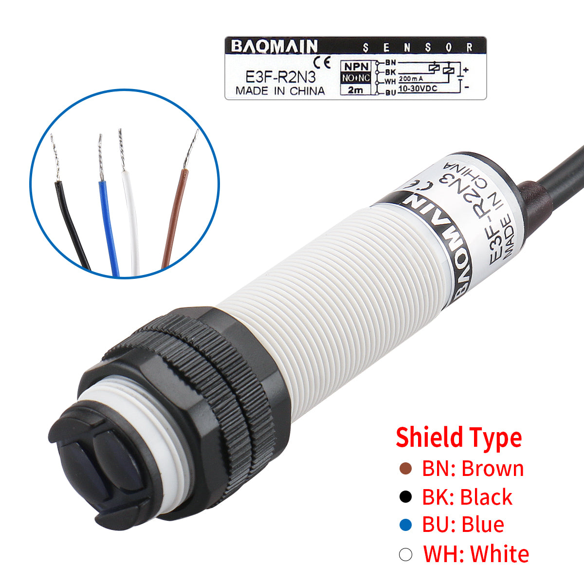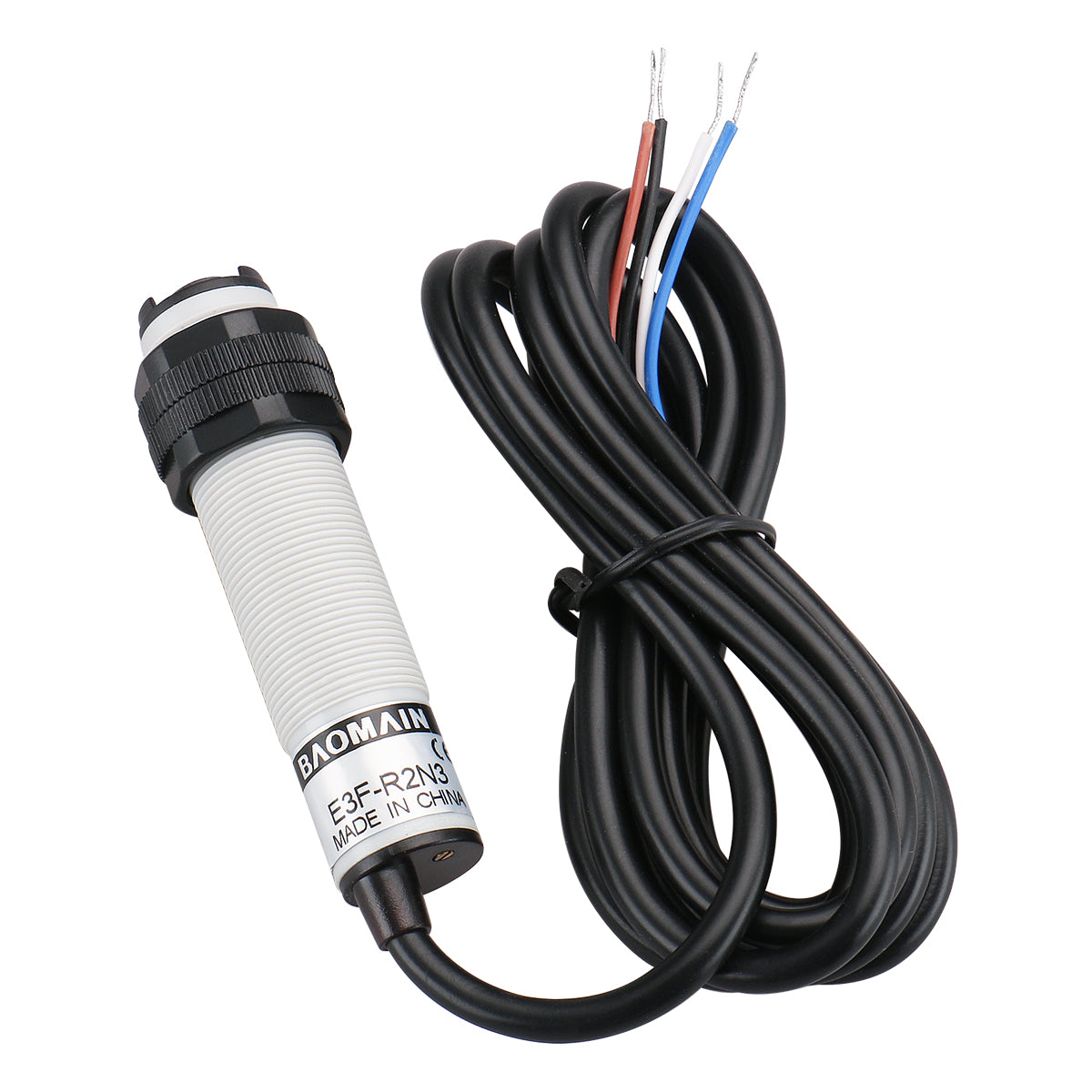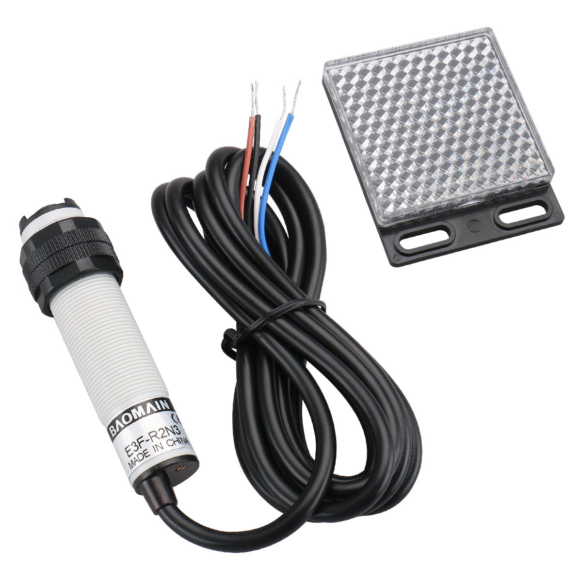 Baomain Photoelectric Sensor E3F-R2N3 Retroreflective Optical Sensor Switch DC 10-30V NPN NO+NC Sensing Distance 2m 4 Wires with Reflector Panel