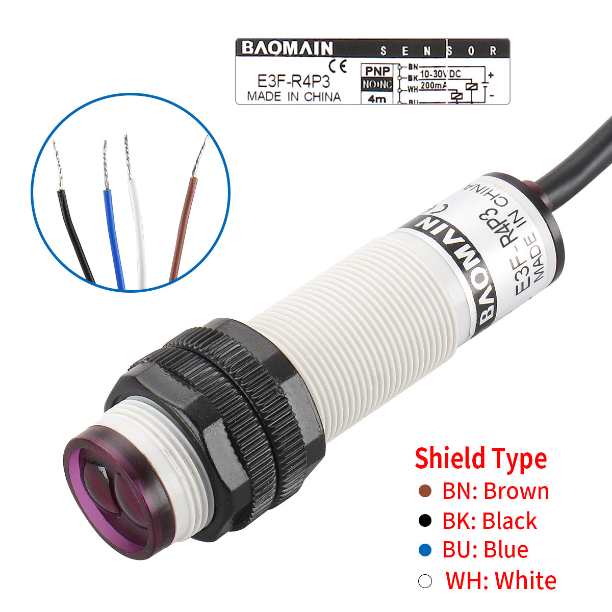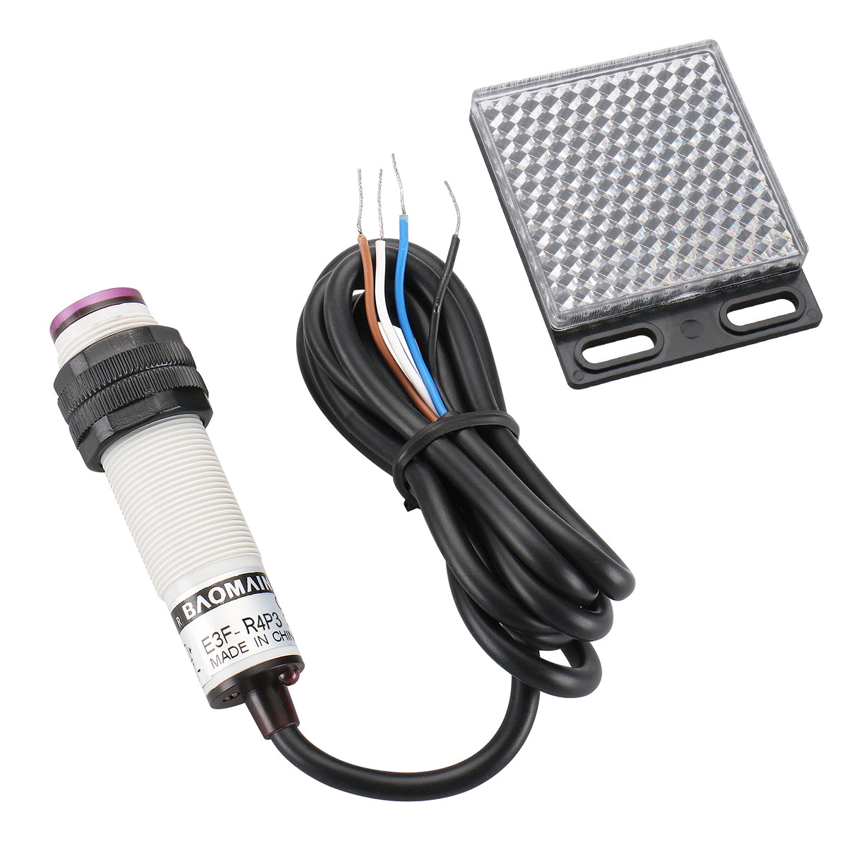 Baomain Photoelectric Sensor E3F-R4P3 Retroreflective Optical Sensor Switch DC 10-30V PNP NO+NC Sensing Distance 4m with Reflector Panel