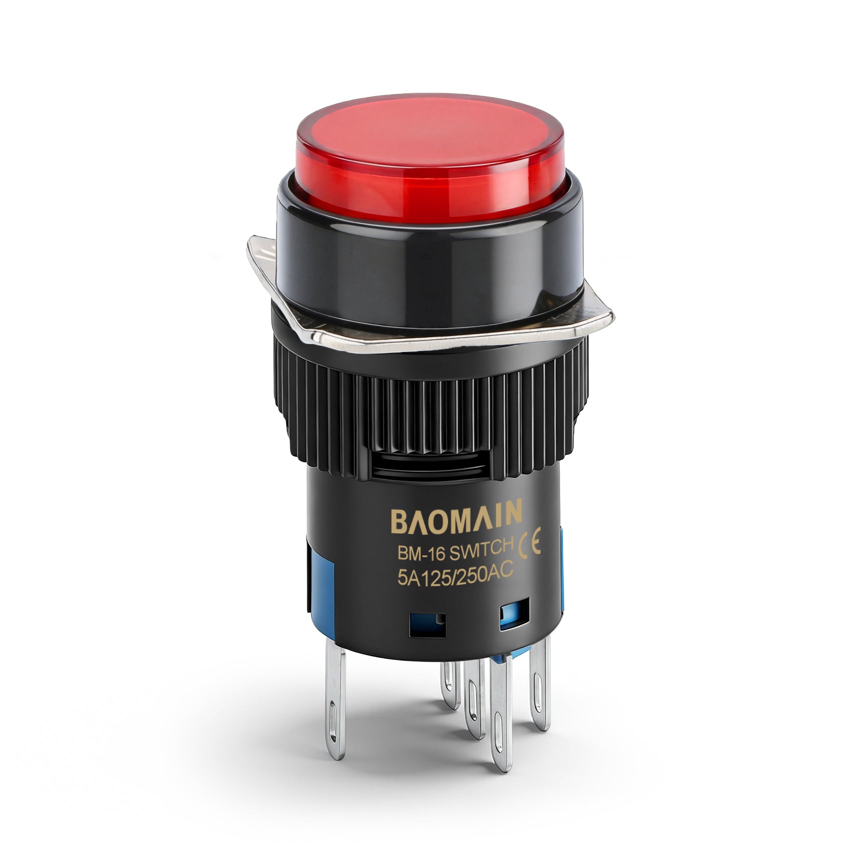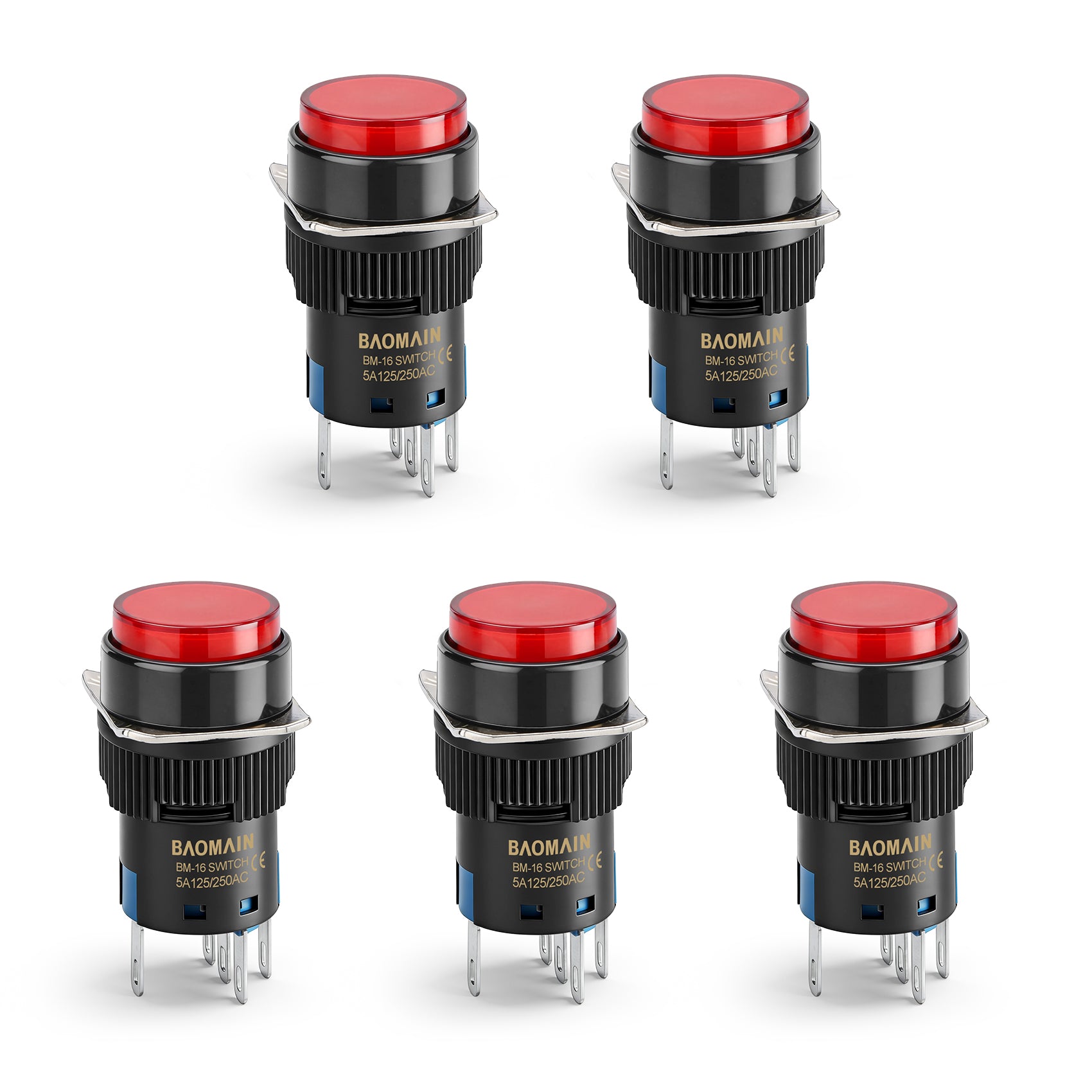 Baomain 16mm Red Latching/Maintained Push Button Switch Round Cap 12V/24V/110V/220V Red LED Lamp SPDT 5 Pin Pack of 5