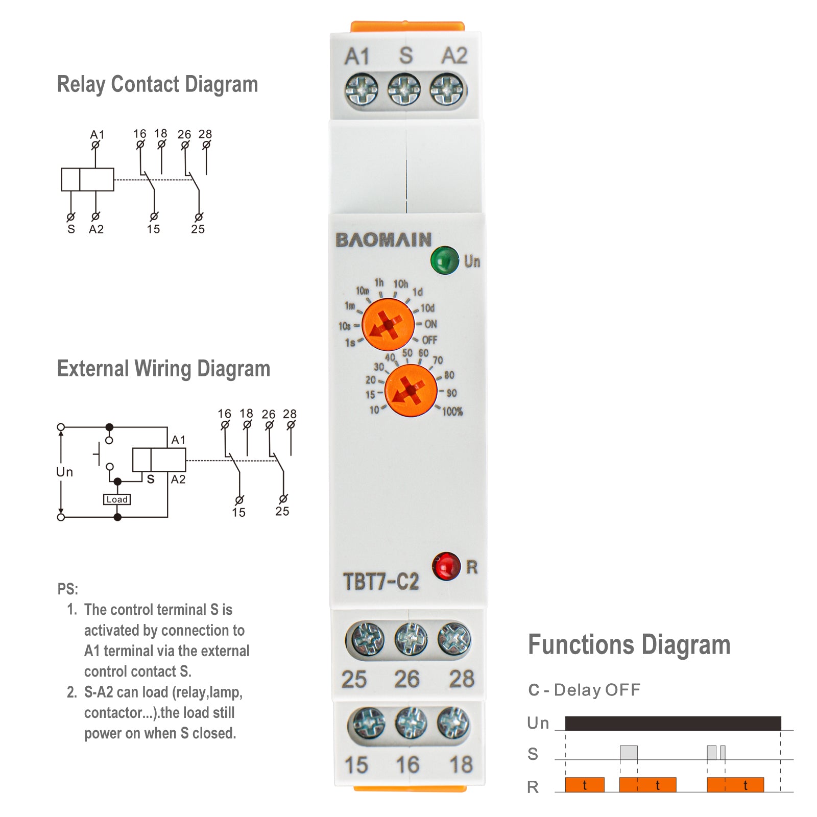 Baomain Multi-Function Time Relay, 16A Delay Off SPDT, DIN Rail Mounting Timer Relay TBT7-C1