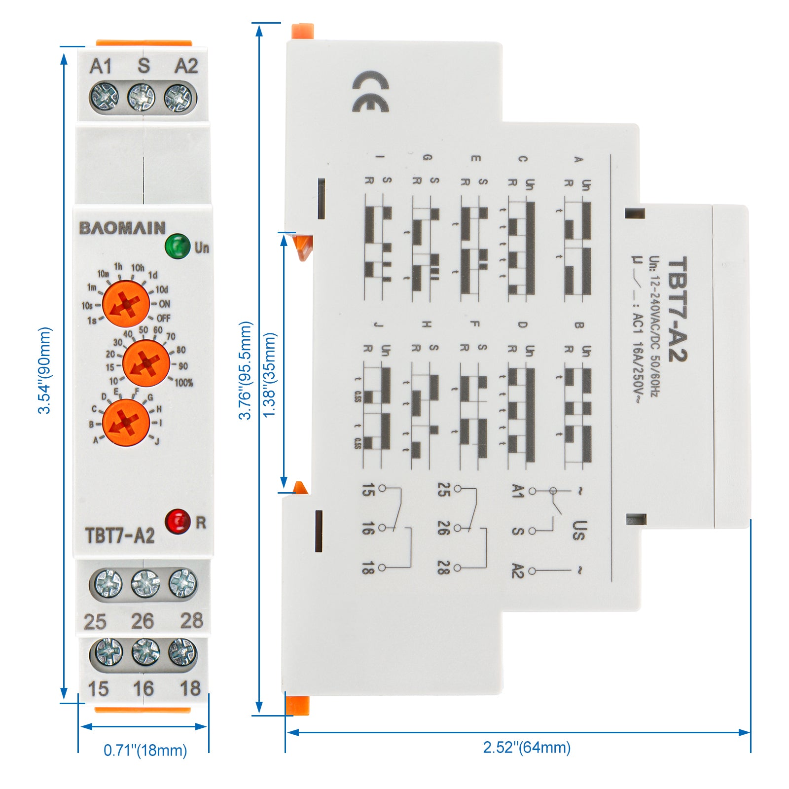 Baomain Multi-Function Time Relay, 16A SPDT 10-Functions, DIN Rail Mounting Timer Relay TBT7-A2
