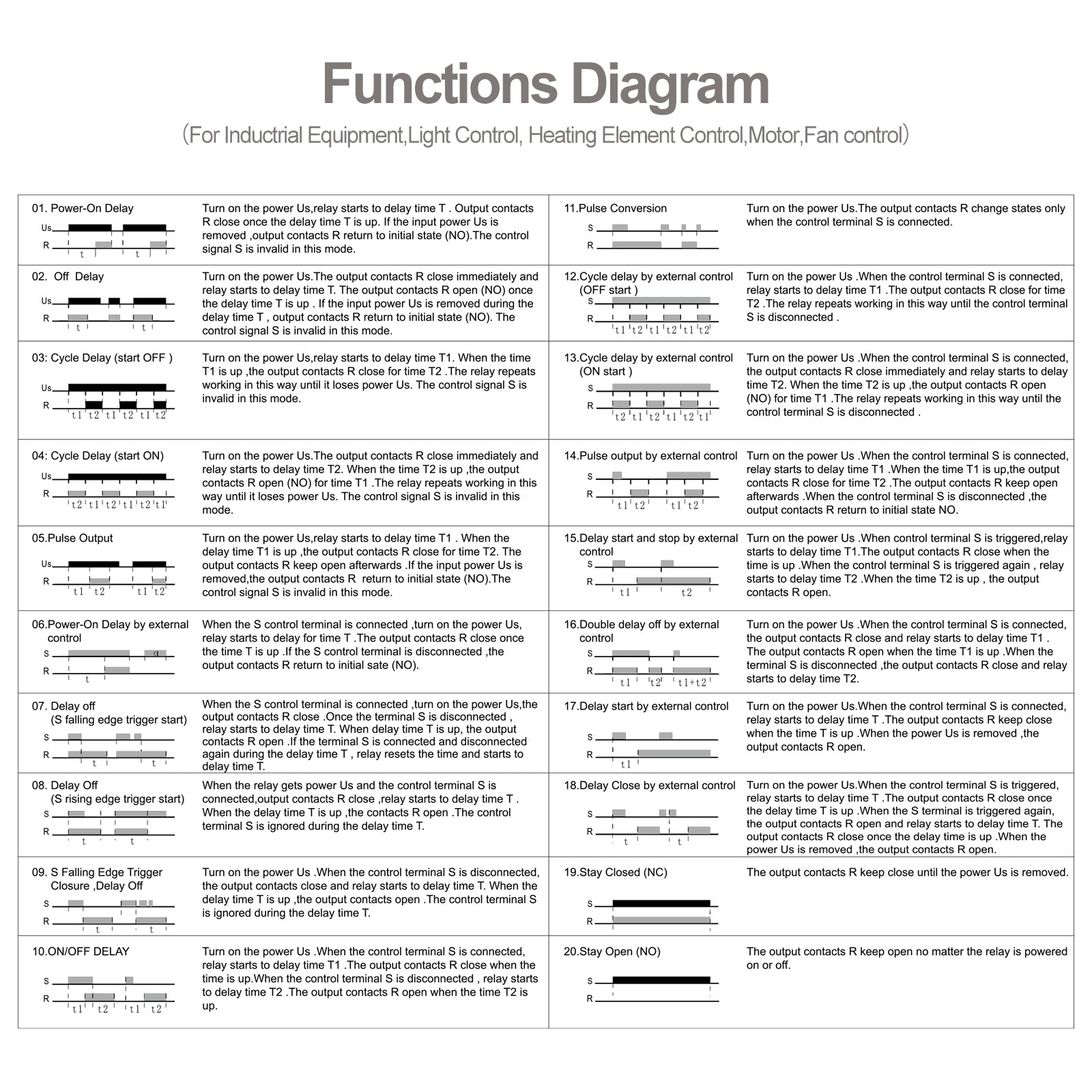 20 Delay Modes: 5 delay modes controlled by power supply,13 delay modes controlled by signal,ON,OFF Mode